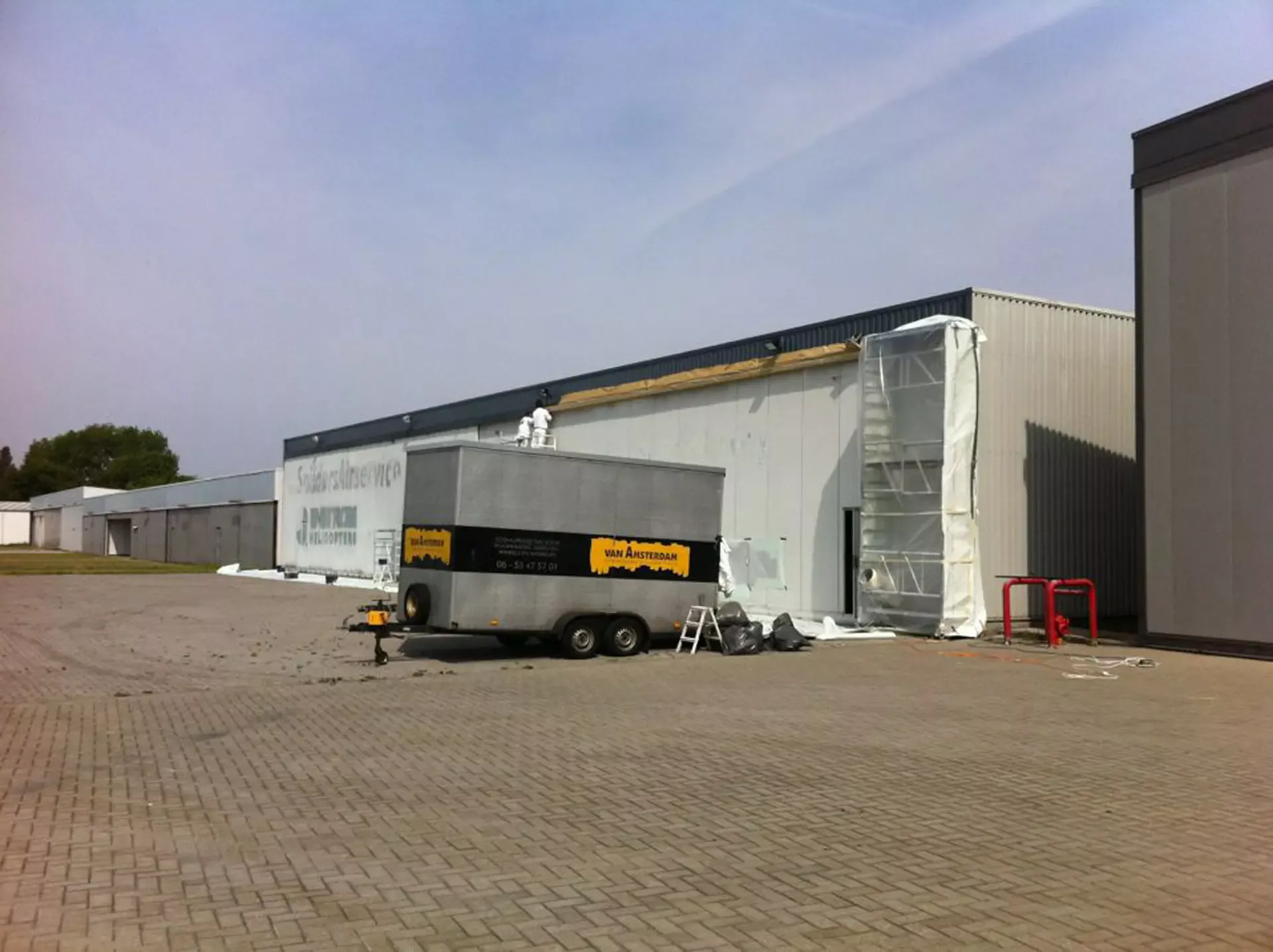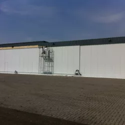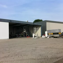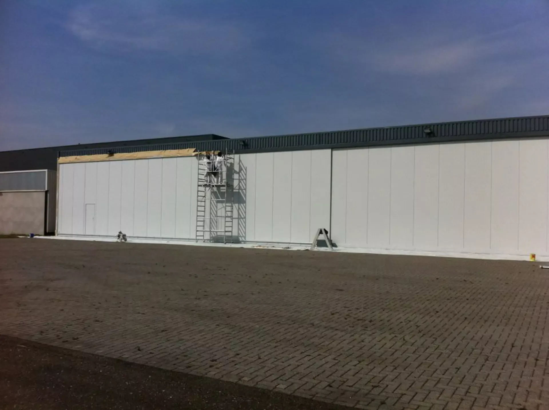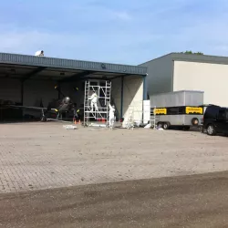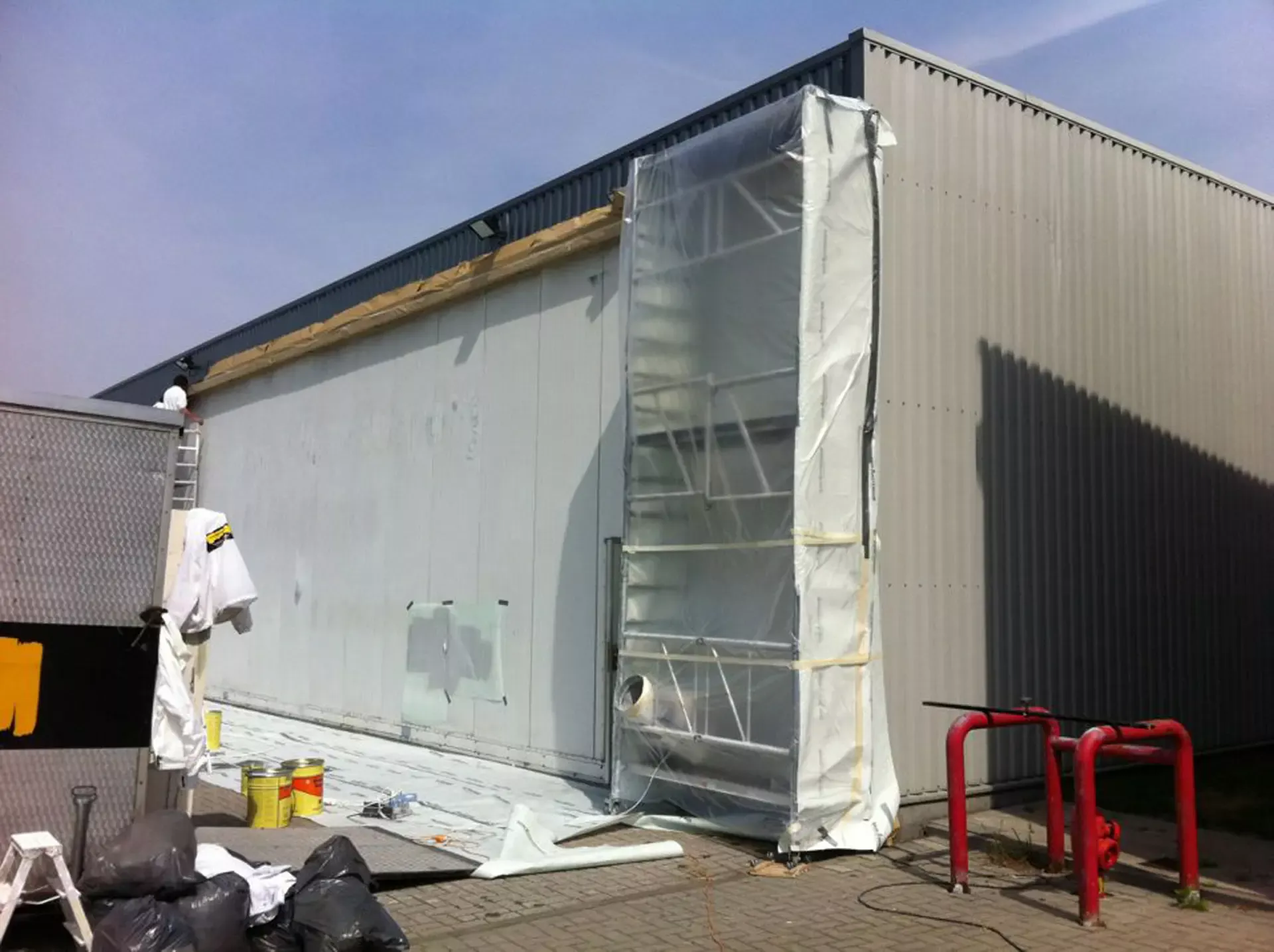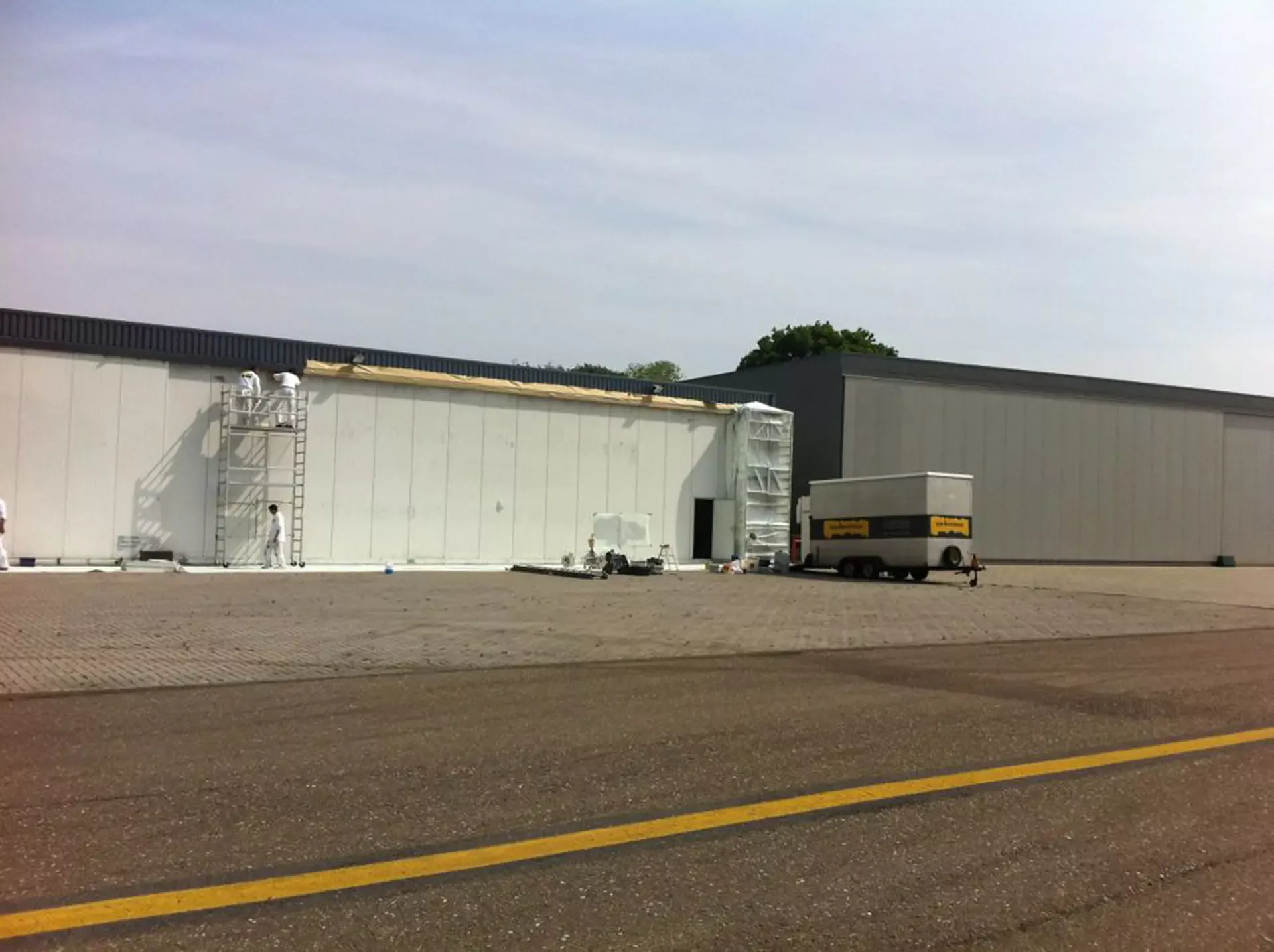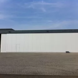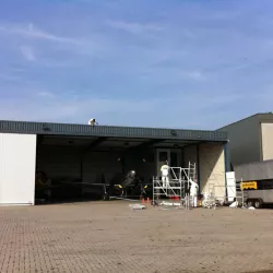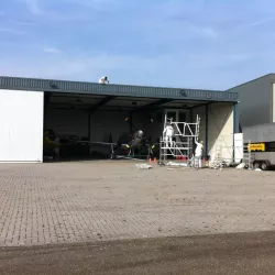 In België kregen we de bijzondere opdracht om de privéhangar van een verzamelaar van historische vliegtuigen te spuiten. De grootste uitdaging hierbij was het voorkomen van verfnevel op de onschatbare vliegtuigen. Met behulp van ons standaard afzuigsysteem hebben we rondom de steiger een vacuümunit gecreëerd, waardoor we veilig konden werken zonder risico op schade. De 40 meter lange deuren zijn vervolgens behandeld met een roestwerende verf, die garant staat voor minstens 10 jaar onderhoudsvrij gebruik.