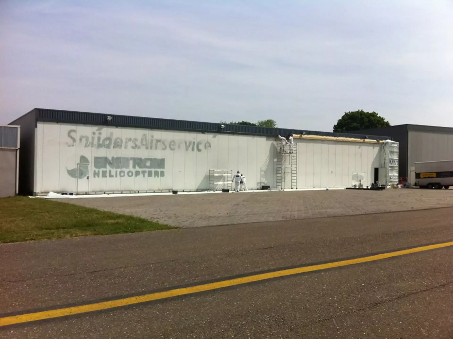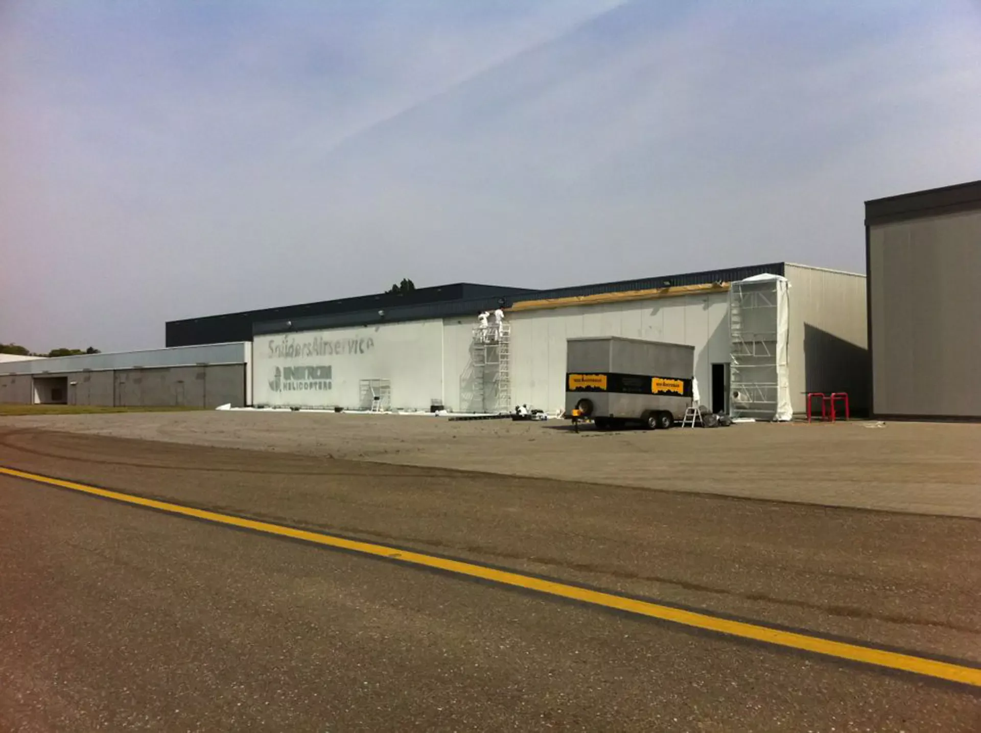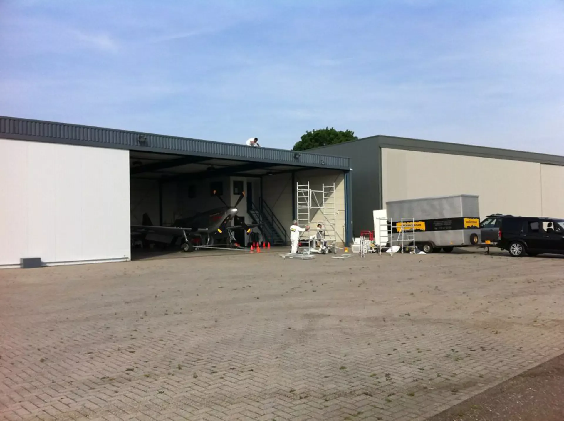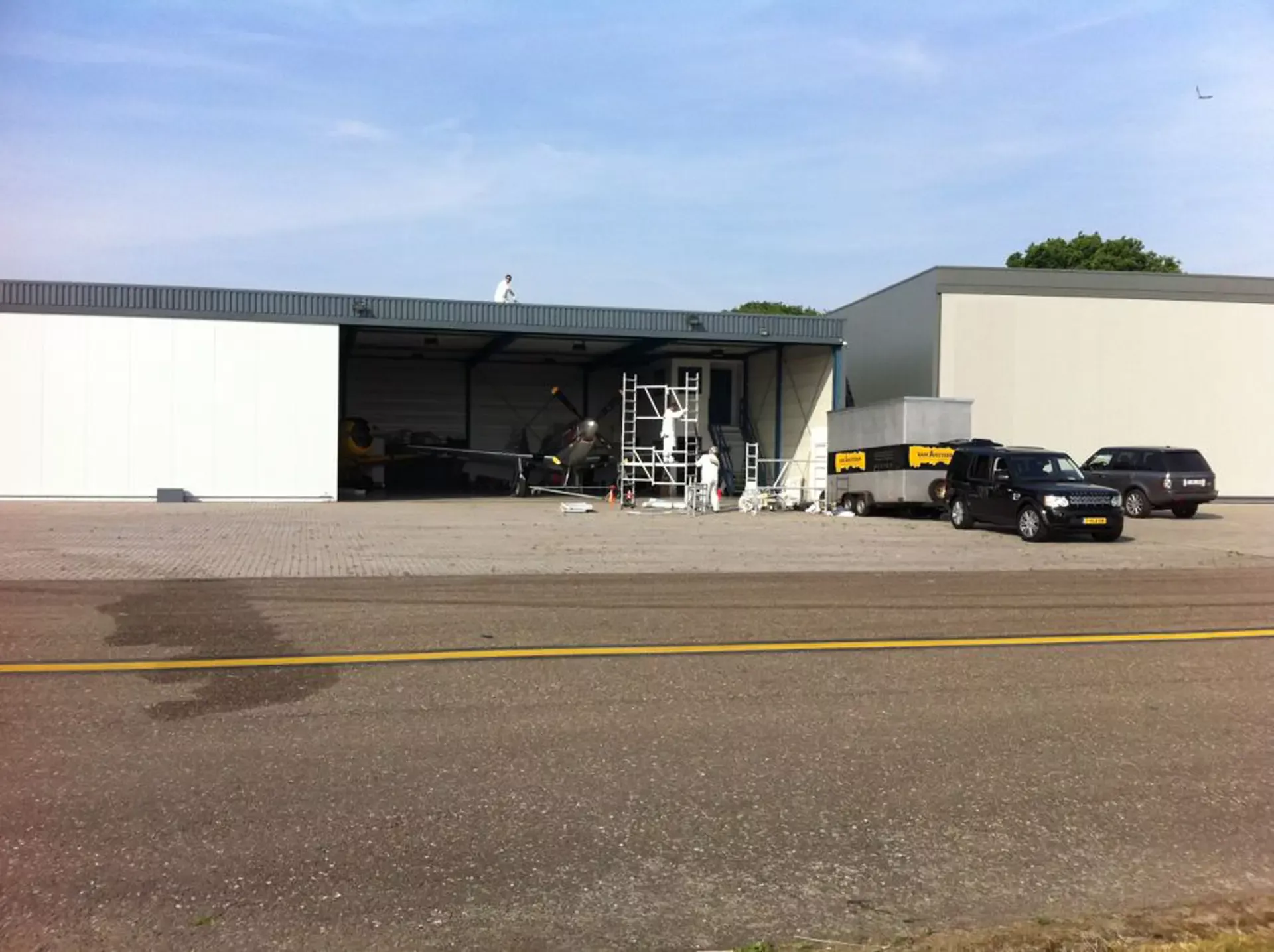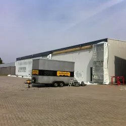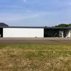 In België kregen we de bijzondere opdracht om de privéhangar van een verzamelaar van historische vliegtuigen te spuiten. De grootste uitdaging hierbij was het voorkomen van verfnevel op de onschatbare vliegtuigen. Met behulp van ons standaard afzuigsysteem hebben we rondom de steiger een vacuümunit gecreëerd, waardoor we veilig konden werken zonder risico op schade. De 40 meter lange deuren zijn vervolgens behandeld met een roestwerende verf, die garant staat voor minstens 10 jaar onderhoudsvrij gebruik.