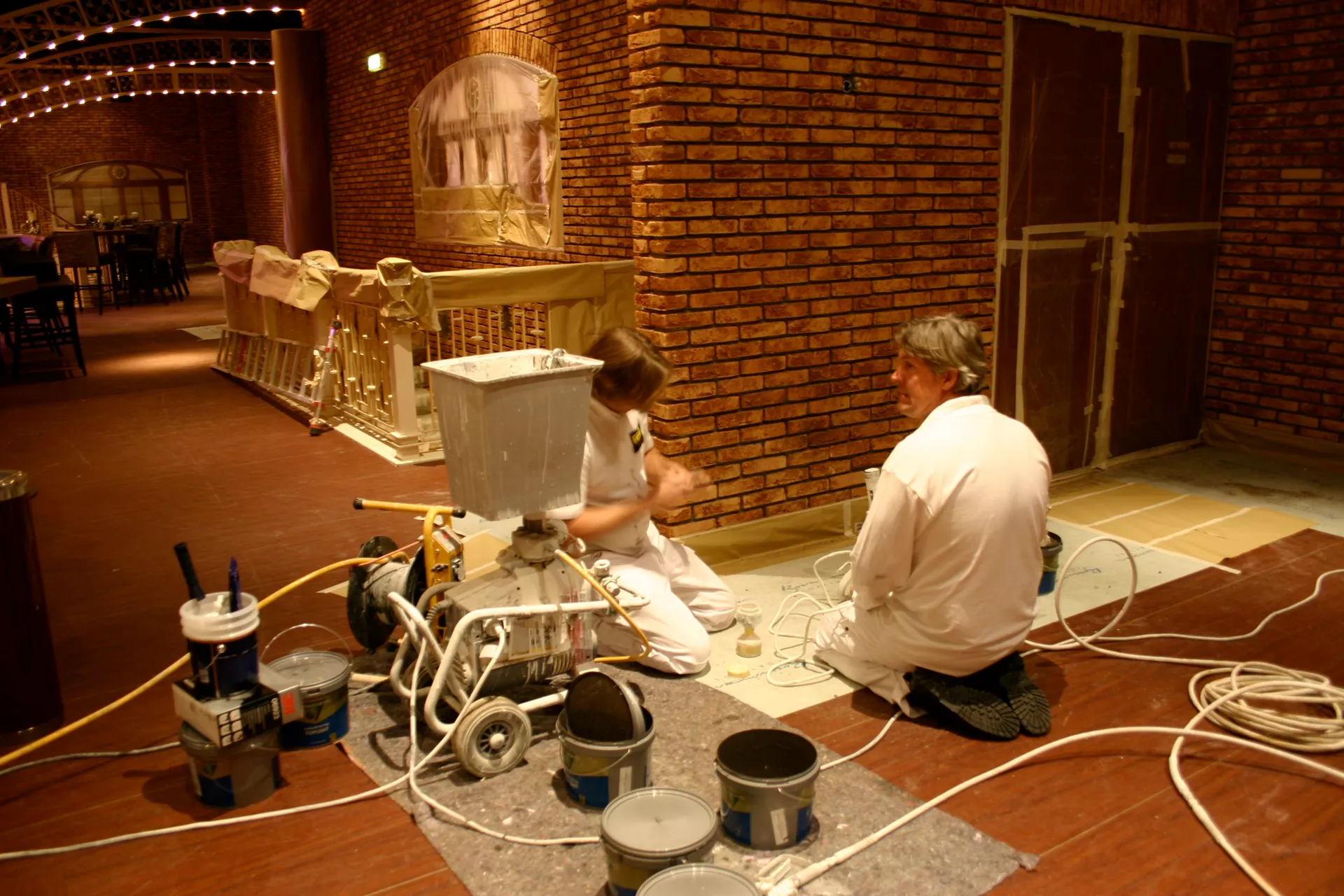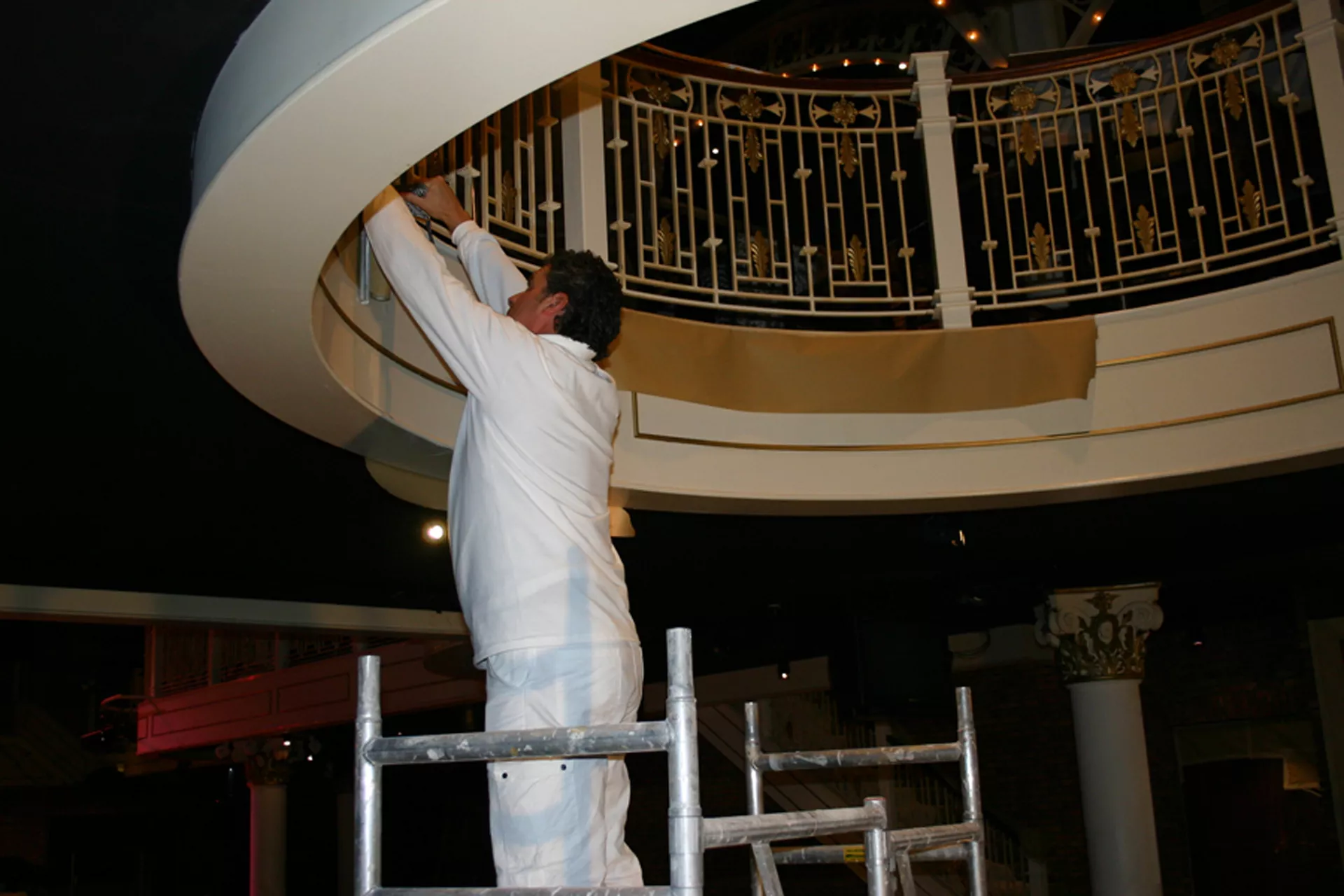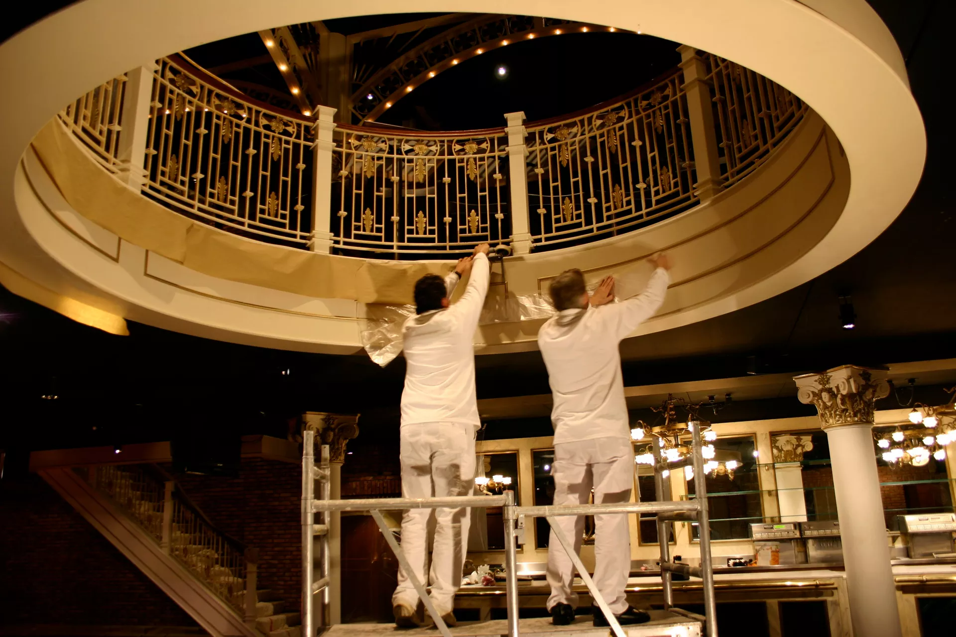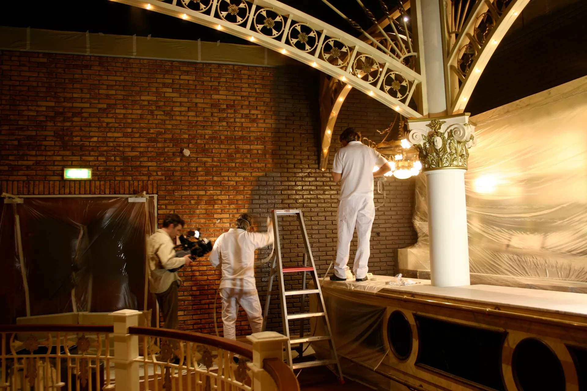 In de Ballroom hebben wij alle wanden gespoten in antracietkleur met afneembare zijdeglansverf. Het houtwerk en de metalen hekken zijn afgewerkt met hoogglanswit, wat zorgt voor een strakke en moderne uitstraling.