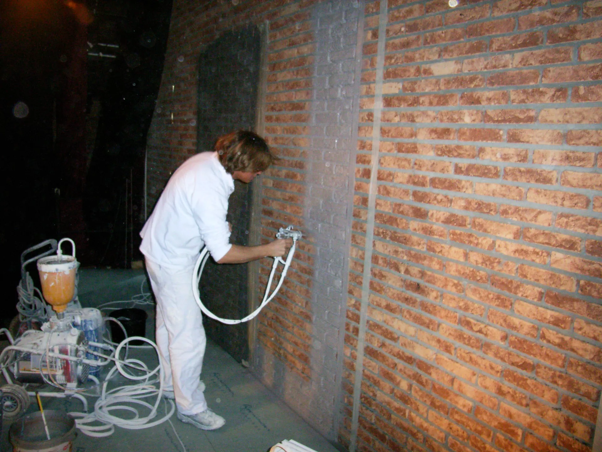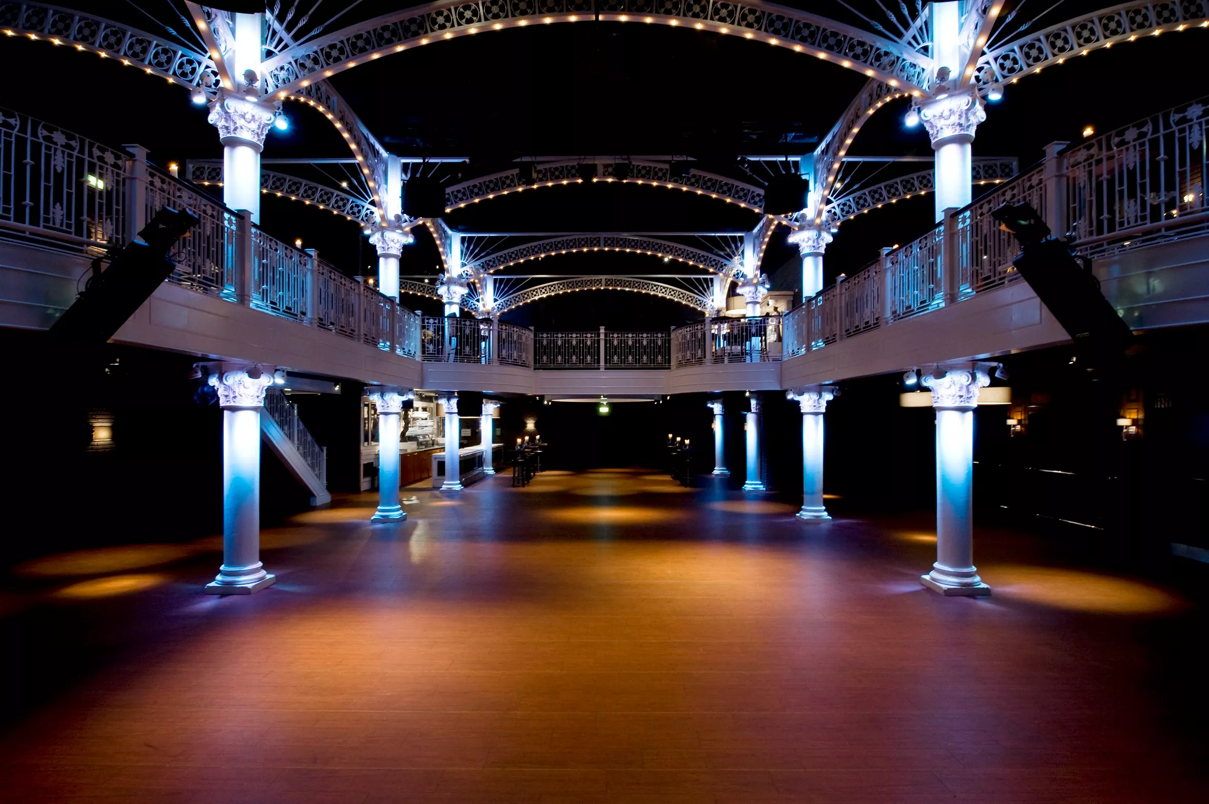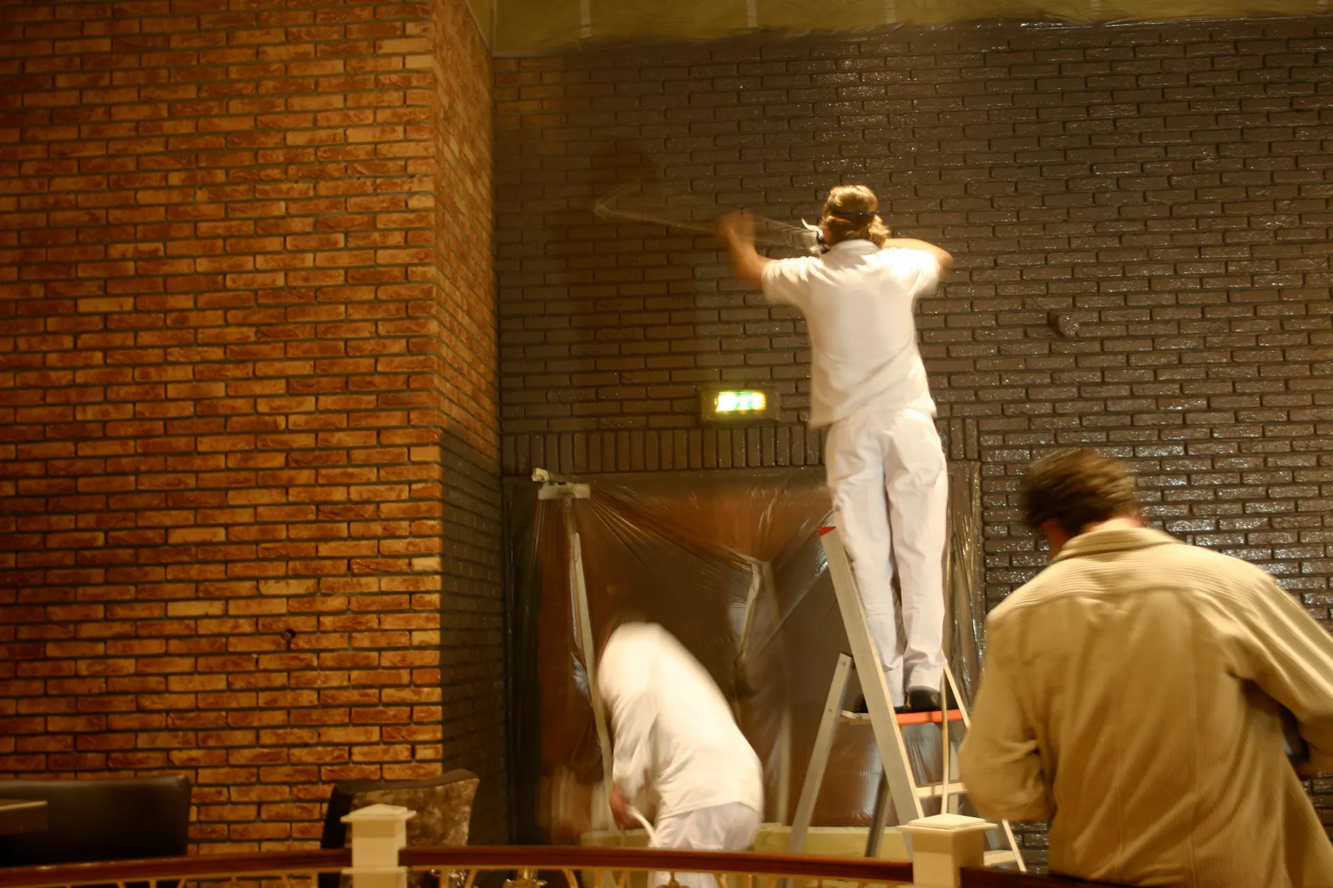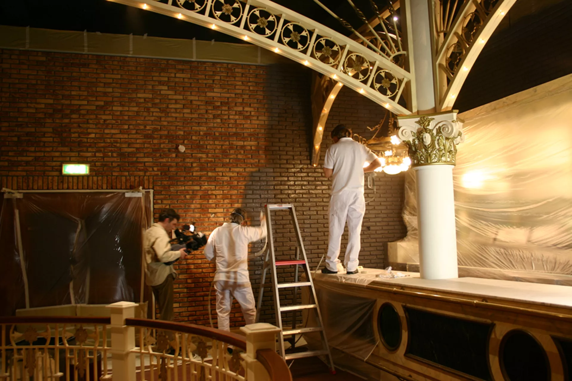 In de Ballroom hebben wij alle wanden gespoten in antracietkleur met afneembare zijdeglansverf. Het houtwerk en de metalen hekken zijn afgewerkt met hoogglanswit, wat zorgt voor een strakke en moderne uitstraling.