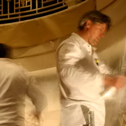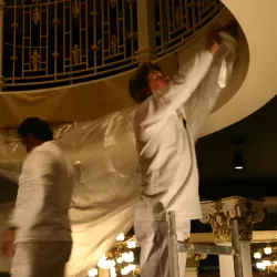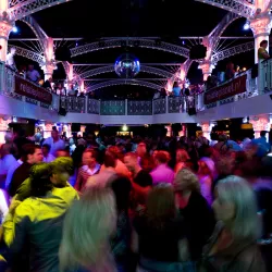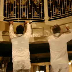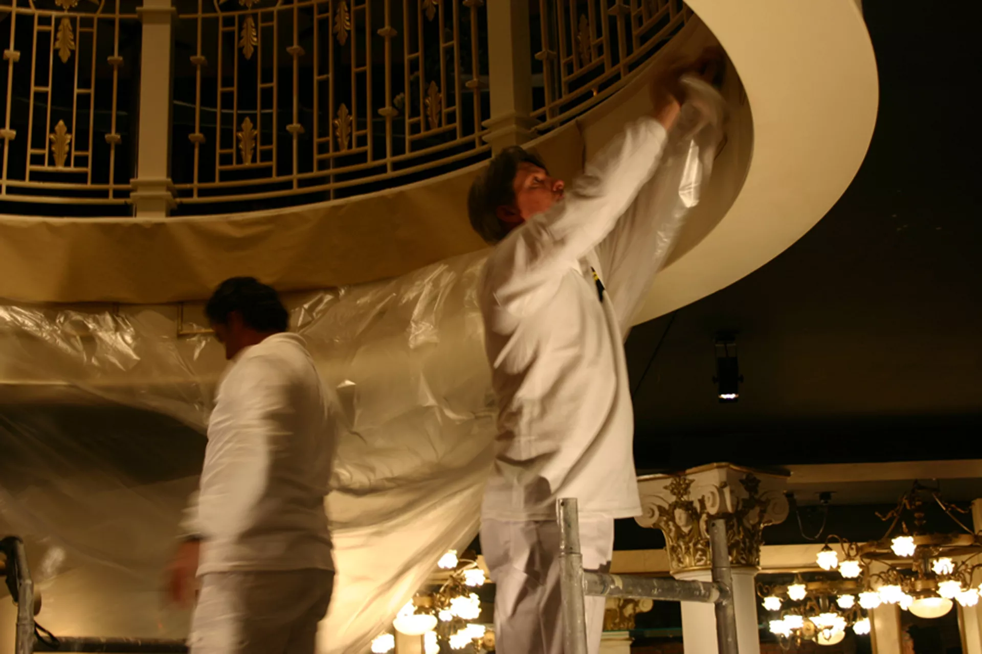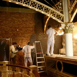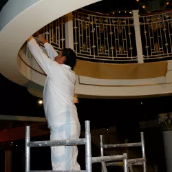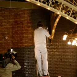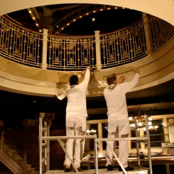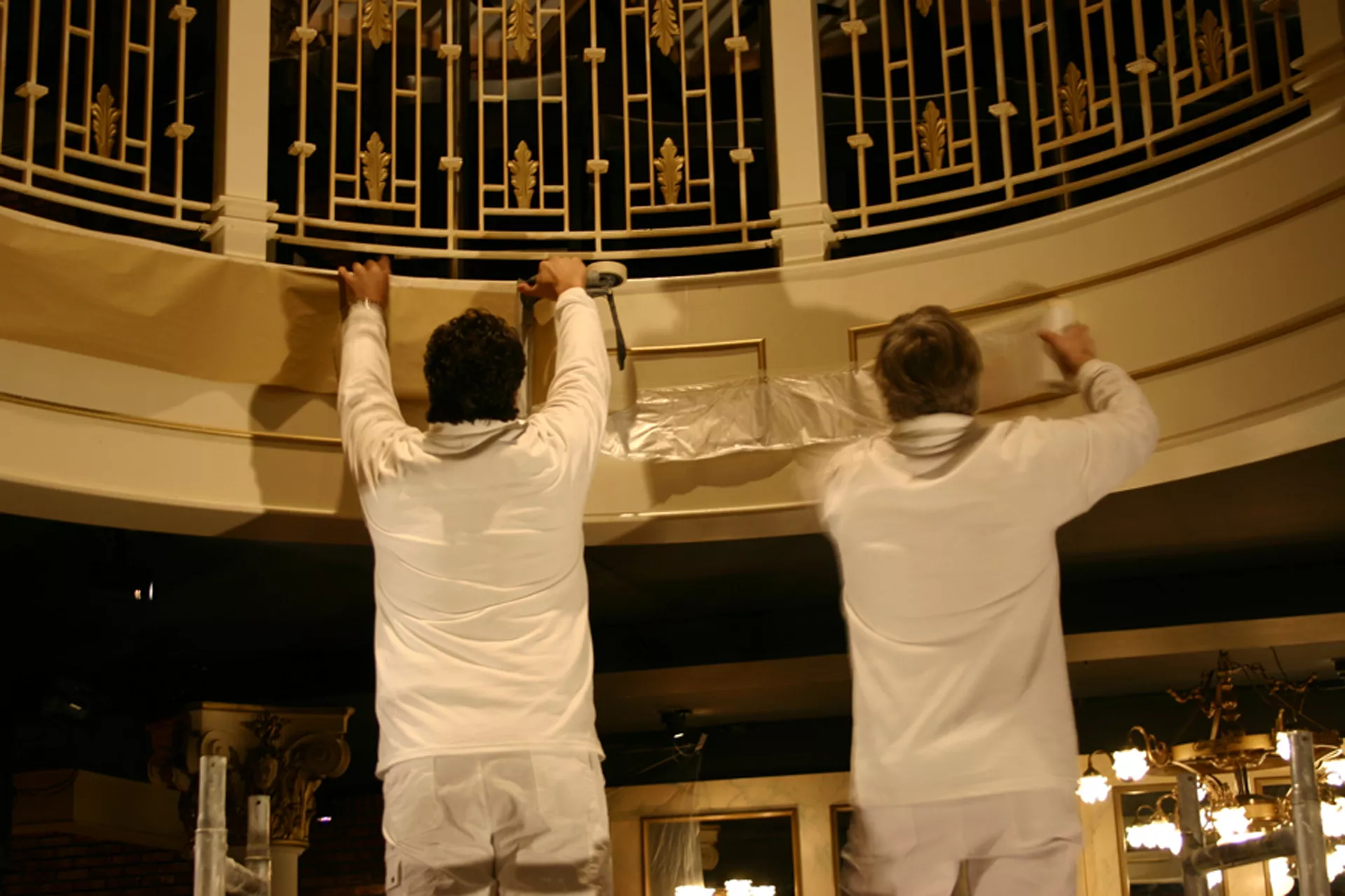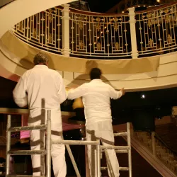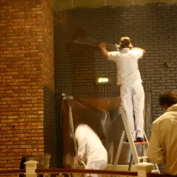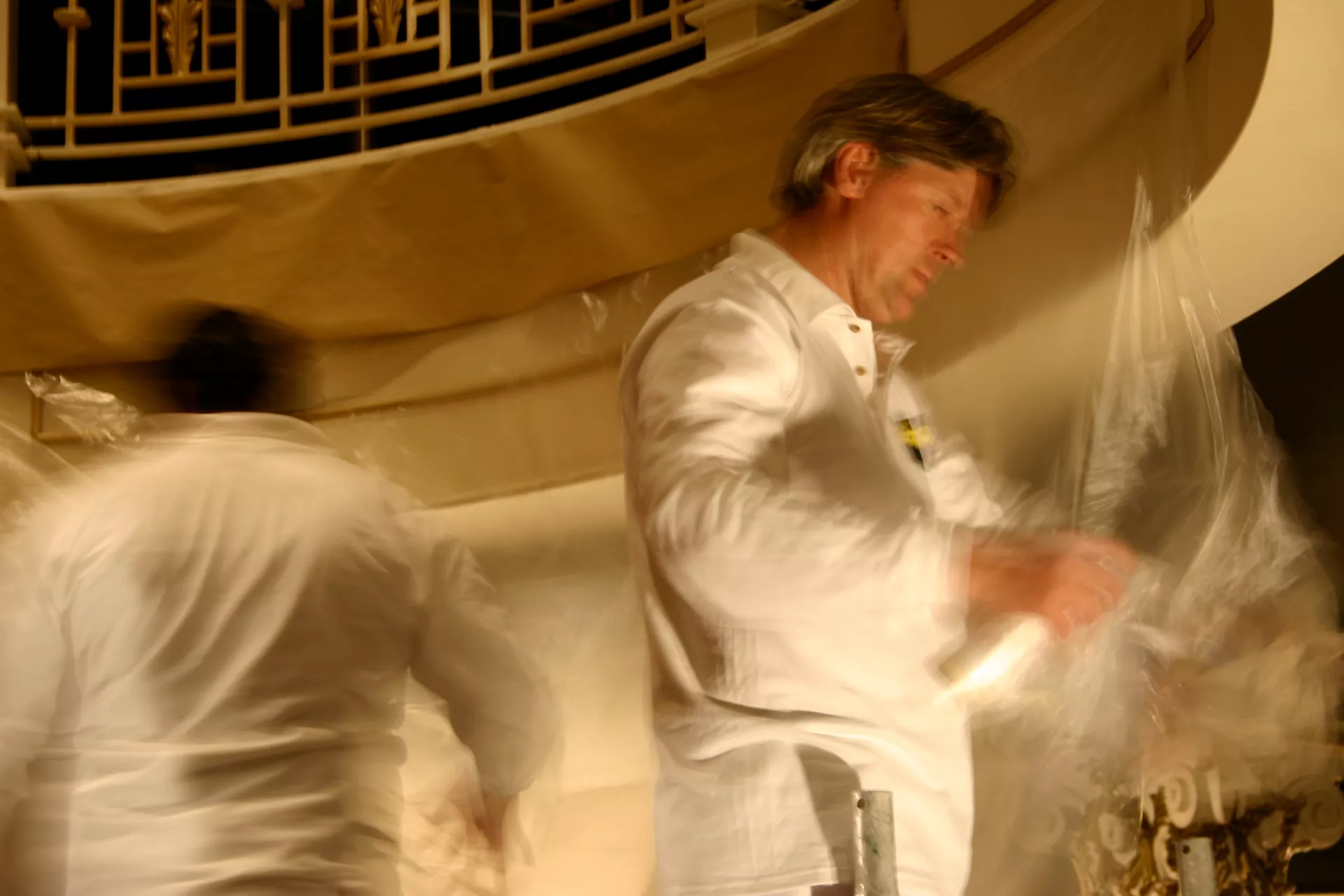 In de Ballroom hebben wij alle wanden gespoten in antracietkleur met afneembare zijdeglansverf. Het houtwerk en de metalen hekken zijn afgewerkt met hoogglanswit, wat zorgt voor een strakke en moderne uitstraling.